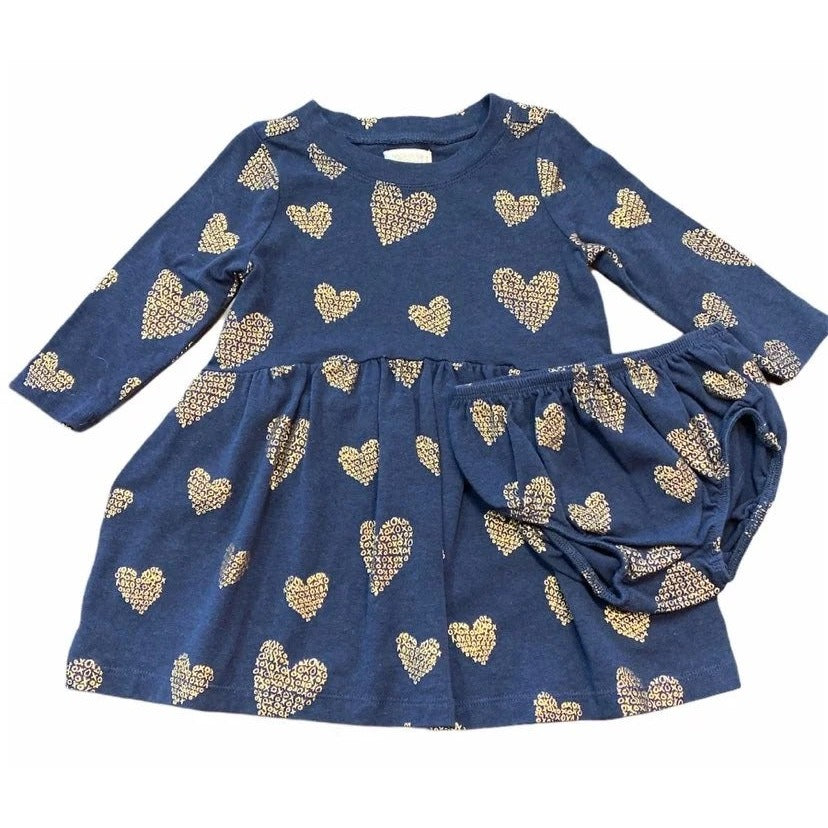 Long sleeve navy cotton dress with gold hearts & matching bloomers